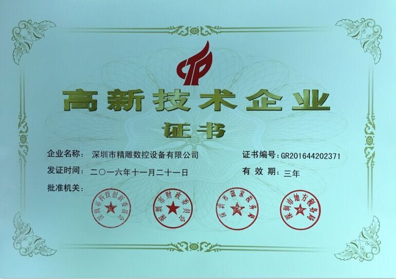 深圳市精雕數(shù)控設備有限公司2017年正式拿到國家國高企業(yè)認定證書。