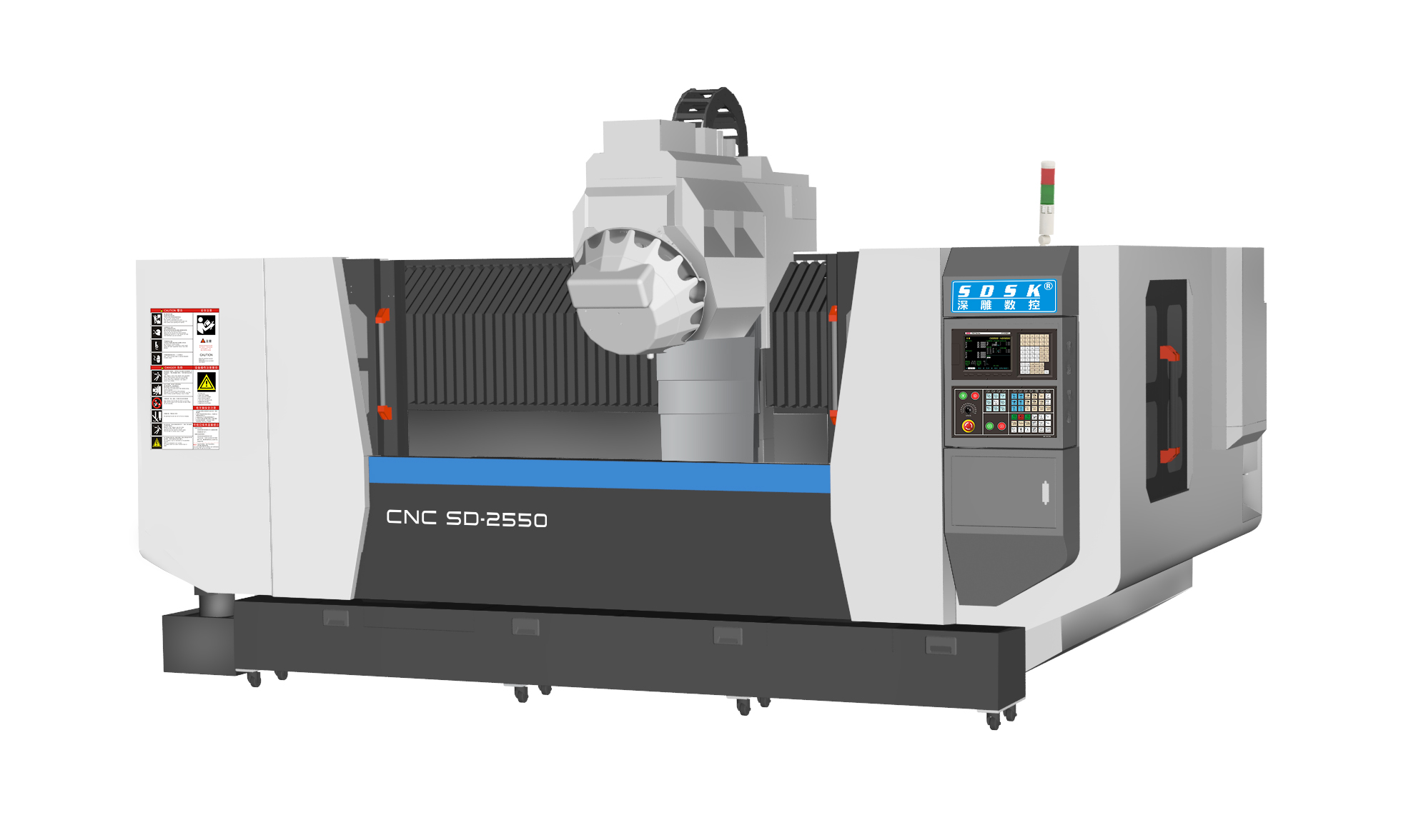 SD2550機型是專門為客戶量身定做的大型鋁型材鉆攻加工中心; 運動方式為Y軸工作臺前后移動,X軸機頭左右移動,Z軸主軸上下移動。臺灣圣杰16位夾臂式刀庫,換刀速度為2秒,大大提高生產效率; 采用三菱數控系統;機身為鑄鐵結構;三軸采用臺灣上銀P級直線導軌,研磨級滾珠絲桿,德國聯軸器,三菱伺服電機,先進的主軸制冷系統,自動潤滑系統,冷卻液循環噴水系統,保證了更高的加工精度、速度與穩定性;;特別適用于各類鋼、銅、鋁、壓克力、塑料等零件的精密雕銑、鉆孔、攻牙加工。