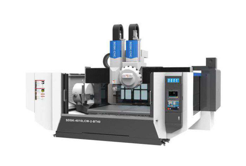 1. SDSK4010LCW-2-BT40機型是專門為客戶量身定制的立臥一體加工中心,定梁式龍門結構;運動方式為X軸帶機頭上的臥軸和立軸同時左右運動,Y軸工作臺前后運動,Z1軸裝臥軸、Z2軸裝立軸,Z1Z2軸可單獨上下運動,臥軸配有CC軸可±540·旋轉,Z1軸臥軸+Z2軸立軸循環聯動完成五體加工。